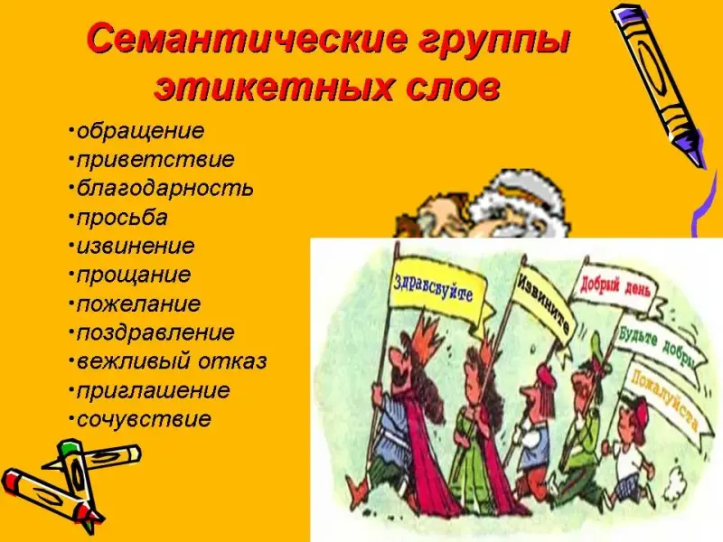 Этикетные речевые формулы служат для выражения различных коммуникативных значений, и по этому признаку их можно разделить на несколько семантических групп. Этикетные формулы используются для: