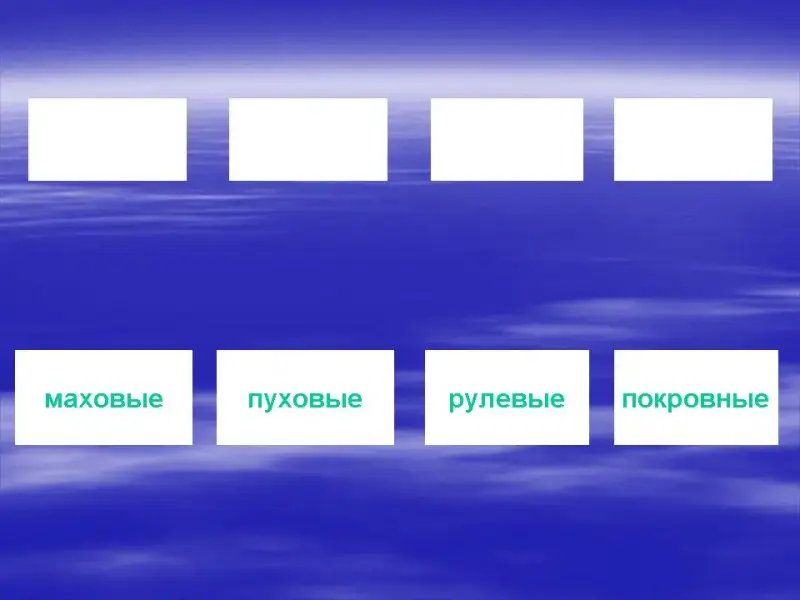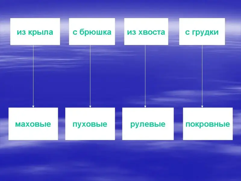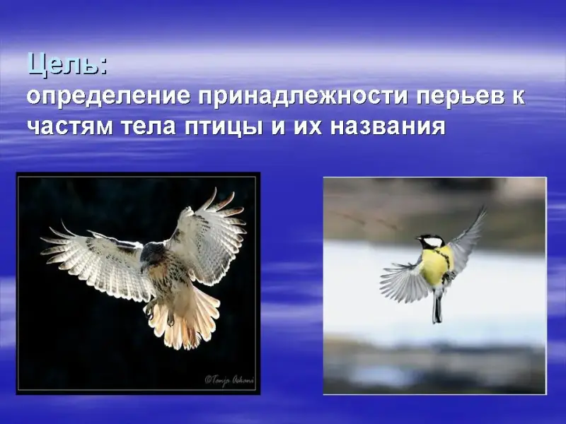 - Какой покров у птиц? Какие перья у птиц? (Легкие, упругие, прочные, теплые. Перья согревают птицу, защищают её тело от повреждений, помогают во время полета).