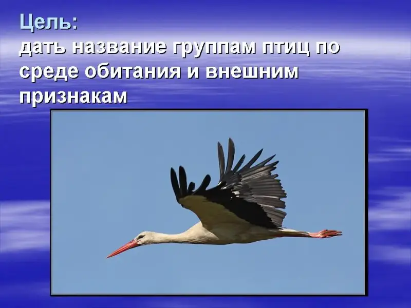 СЛАЙД. Цель: дать название группам птиц в зависимости от среды обитания и внешних признаков.