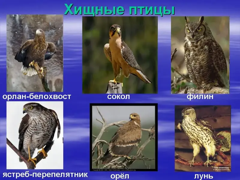 СЛАЙД. Хищные - острый загнутый клюв, мощные ноги и когти, острое зрение.