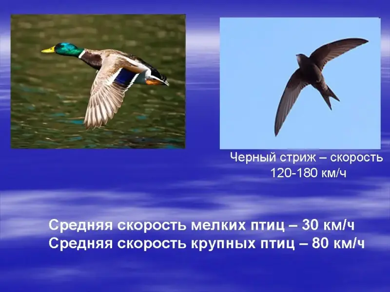 СЛАЙД. По мнению орнитологов, средняя скорость перелёта для мелких птиц составляет порядка 30 км/час, а для крупных около 80 км/час. Часто полёт проходит в несколько этапов с остановками для отдыха и кормления. Чем меньше по размеру птица, тем короче дистанция, которую они в состоянии осилить за один раз. Некоторые мелкие птицы способны лететь беспрерывно 70 - 90 часов, при этом преодолевая расстояние до 4000 км. А мы это расстояние на самолете преодолеваем за 4 часа. Неслучайно самолёт назвали железной птицей.