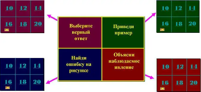 Игра строится на работе с презентацией. Приложение 1. Запускаем презентацию и нажимаем кнопку "Начать игру". Вашему вниманию предлагается четыре категории вопросов, чтобы выбрать категорию вопросов необходимо нажать на названии категории. В каждой категории по шесть вопросов: 10, 12, 14, 16, 18, 20 баллов. Вопросы распределены по уровню сложности. Выбирая вопрос, нажимаем на количестве баллов и активированная ссылка на вопрос будет отражаться желтым цветом, что наглядно демонстрирует выбранные вопросы и вопросы на которые еще не отвечали. После ответа на поставленный вопрос надо нажимать (рисунок 7), для того чтобы вернутся к выбору категории вопросов.
