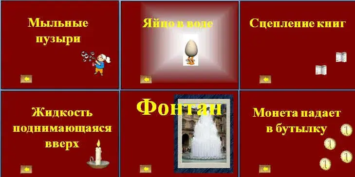 Оборудование для опытов: мыльный раствор и устройство при помощи которого будем надувать пузыри, два сосуда с водой, соль, 2 яйца, две книги, неглубокое блюдце, подкрашенная жидкость, свеча, стакан, бутылка с широким горлышком (из под кефира), монета, длинная линейка, кольцо склеенное из бумаги диаметром 15 см, прибор для демонстрации фонтана.