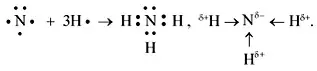 Аммиак среди соединений азота является летучим водородным соединением. В свободном состоянии он нигде не встречается. Образует соли, в которых выступает в роли щелочного металла. У всех в домашних аптечках обязательно есть его водный раствор - нашатырный спирт. Его химическая формула NH3 В молекуле содержится один атом азота и три атом водорода. Рассмотрим строение атома азота. На последней оболочке у него пять валентных электронов. Схема строения атома азота выглядит так: