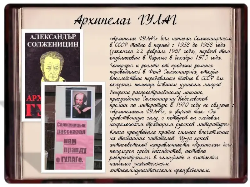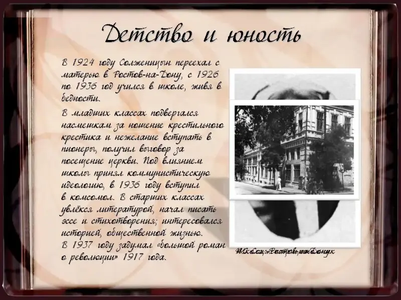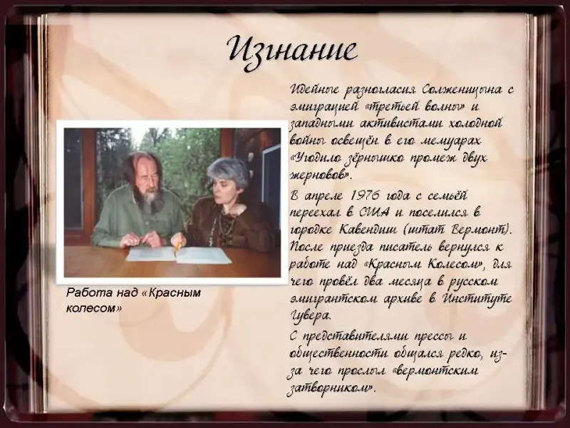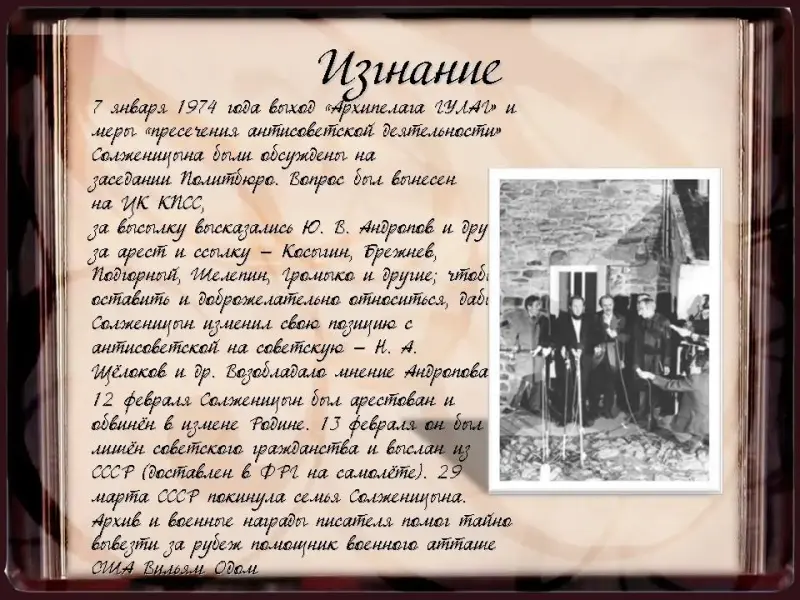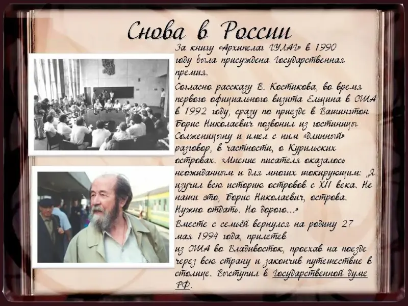 Цель урока-презентации по биографии А.И. Солженицына - не только способствовать созданию живого, яркого, и порой такого противоречивого образа писателя, но и воздействовать на разные сферы восприятия: эмоции, мышление, воображение, создание положительного настроя на работу; увеличить объем изучаемого материала за счет экономии времени учителя и учеников, активизировать самостоятельную деятельность школьников, расширить возможность применения дифференцированного подхода в обучении, осуществить межпредметные связи, а в целом- способствовать реализации целей, поставленных учителем, добиться наибольшей эффективности урока.