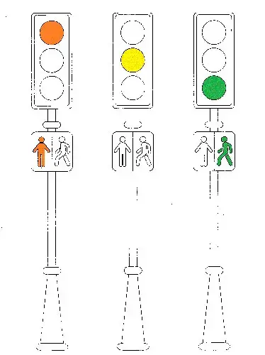 Но светофор с двумя цветами оказался не удобным, т.к. люди не успевали понять в какой момент им уже можно начинать движение. Часто возникала путаница. Тогда появился светофор с тремя цветами. Третий цвет - жёлтый, стал промежуточным, он обозначал - "приготовится к движению. Такой светофор стоял на "ножке", то есть на стойке (демонстрация модели светофора и принципа его действия). Чтобы он работал, также нужен был человек, который при помощи цепей поднимал диск то с красным, то с жёлтым, то с зелёным цветом.