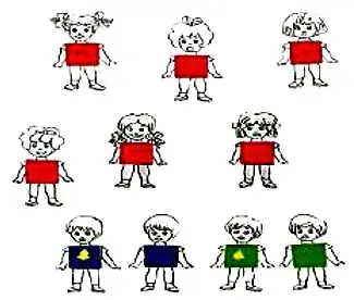 Гласные - девочки. Их 6. Полуоткрытый рот говорит о свободном выдохе, положение губ - схематичная артикуляция гласных звуков, колокольчик - звонкость голоса, то есть наличие голоса. Платья у девочек - красного цвета. Согласные - мальчики. Наличие колокольчика - звонкость звука. Синие рубашки - твердые звуки, зеленые рубашки - мягкие звуки.