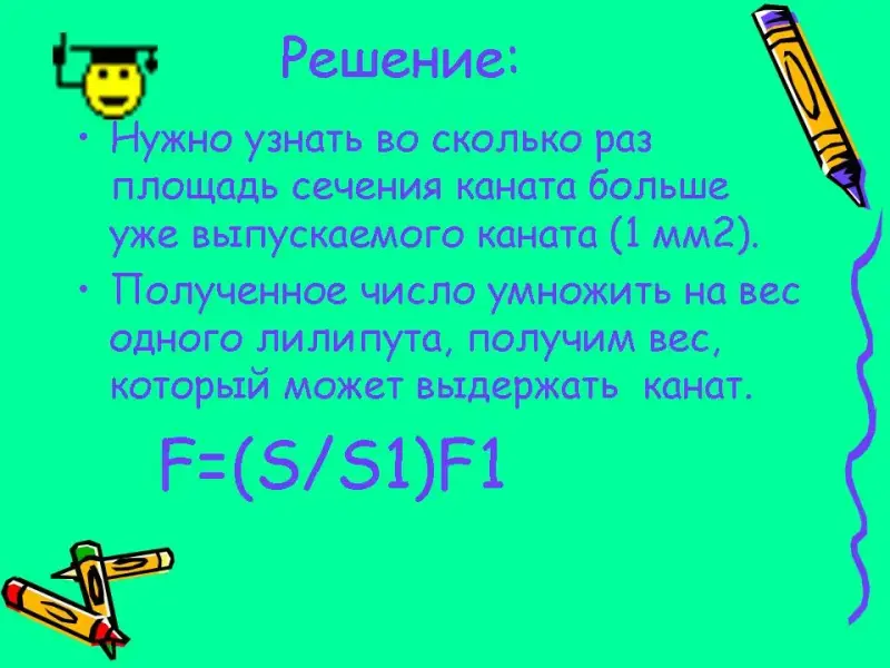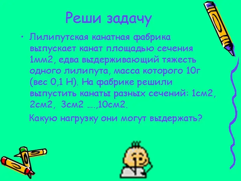 Лилипутская канатная фабрика выпускает канат площадью сечения 1 мм2, едва выдерживающий тяжесть одного лилипута, масса которого 1 г (вес 0,1 Н). На фабрике решили выпустить канаты разных сечений: 1 см2, 2 см2, 3 см2 ….,10 см2.