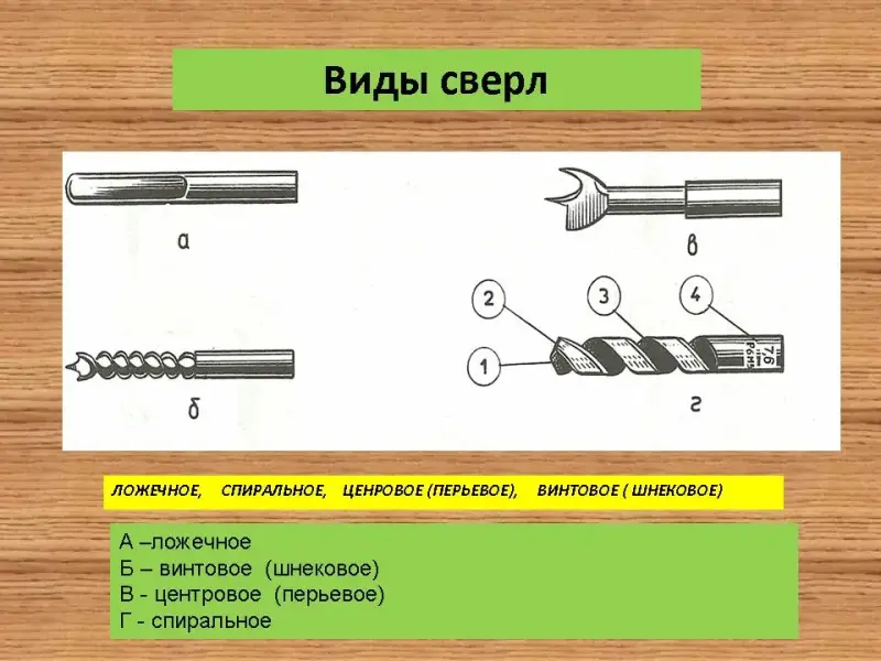 - На слайде представлены 4 вида сверл. Это спиральное, ложечное, винтовое (шнековое), центровое (перьевое). Попробуем классифицировать их по командам (каждая команда отвечает на 2 вопроса).