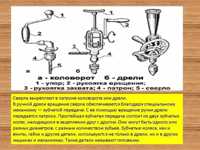- В ручной дрели вращение сверла обеспечивается благодаря специальному механизму - зубчатой передаче. С ее помощью вращение ручки дрели передается патрону. Простейшая зубчатая передача состоит из двух зубчатых колес, находящихся в зацеплении друг с другом. Они могут быть одного или разных диаметров, с разным количеством зубьев. Зубчатые колеса, как и винты, гайки и другие детали, используются не только в дрели, но и в других машинах и механизмах.