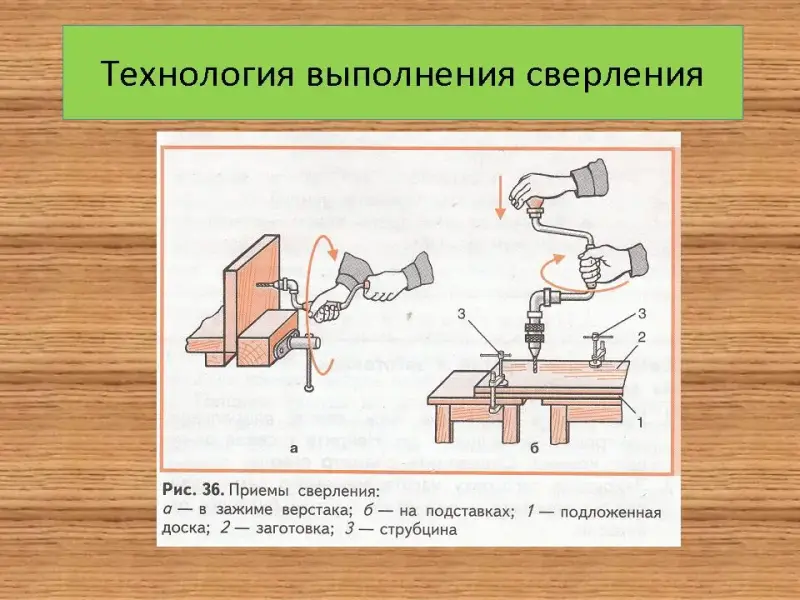 1. Надежно закреплять сверло, заготовку, подкладную доску.