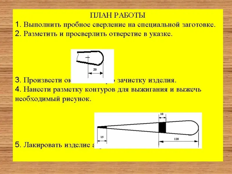 Обучающиеся разбиваются на группы по 3 человека и выполняют пробное сверление на специальной заготовке. Затем наносят центр отверстия и сверлят отверстие в указке. Проводят зачистку изделия, наносят контуры рисунка и группами по 3 человека выполняют выжигание. Лакирование производится по мере окончания предыдущих действий.