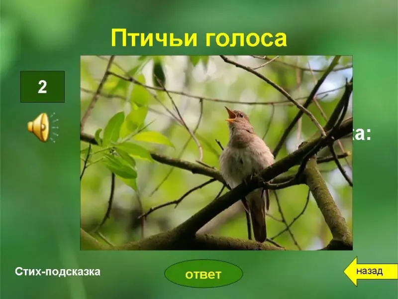 При нажатии секторов слышим звуки, издаваемые птицами. Задача - узнать птицу по голосу. Если ученики не справляются, звучит стих-подсказка. С использованием подсказок, количество баллов уменьшается вдвое.