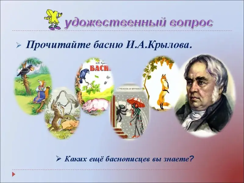 - Каких ещё баснописцев вы знаете? (Эзоп, Лафонтен, Дмитриев и др.)