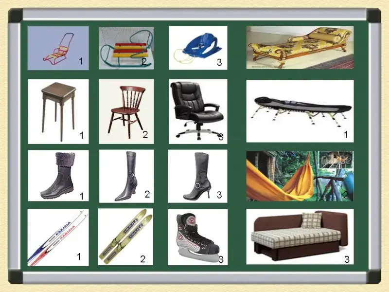 1. Санки, кто любит на них кататься. 2. Кто долго сидит за компьютером, предлагаю выбрать кресло или стул, на котором бы вам было удобно сидеть длительное время. 3. Кто увлекается спортом, выберите спортивный инвентарь, с которым вы пойдёте за новогодней ёлкой в лес. 4. Выберите обувь, в которой удобно ходить зимой, особенно по сугробам. 5. Кто любит полежать, выберите удобную для себя кровать. Обоснуйте свой выбор. |