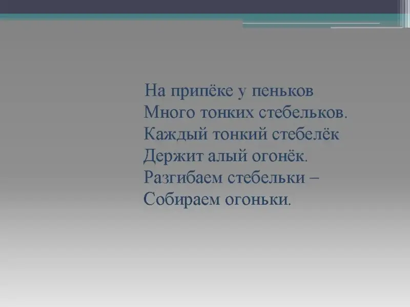 Стоя за столом, поставьте ноги вместе, руки опущены, спина прямая. Сделайте спокойно вдох и выдох, плавно поднимите реки вверх. Держите их ладонями друг к другу, пальцы вместе. Потянитесь всем телом. Вытягиваясь вверх, представьте крепкое, сильное деревце. Высокий стройный ствол тянется к солнцу. Организм как дерево, наливается силой, бодростью, здоровьем. Опустите руки и расслабьтесь.