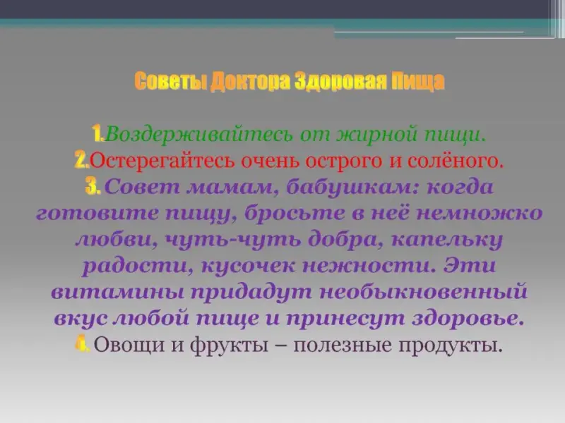 - Совет мамам, бабушкам: когда готовите пищу, бросьте в неё немножко любви, чуть-чуть добра, капельку радости, кусочек нежности. Эти витамины придадут необыкновенный вкус любой пище и принесут здоровье.