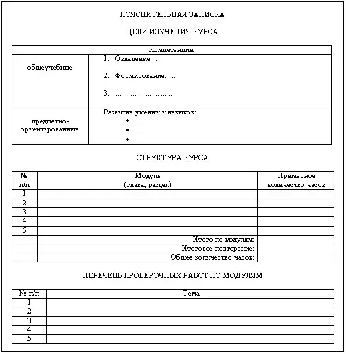 Рабочая учебная программа включает в себя титульный лист, пояснительную записку, календарно-тематический план на текущий учебный год, содержание учебного материала, обязательных лабораторных, практических, контрольных и других работ, результаты образования, способы и формы оценки достижения этих результатов, учебно-методическое и информационное обеспечение курса, список литературы для обучающихся. К рабочим учебным программам могут прикладываться и другие документы, которые необходимы учителю для полноценного и эффективного осуществления образовательного процесса (например, кодификаторы, примерные варианты контроля и т.д.).