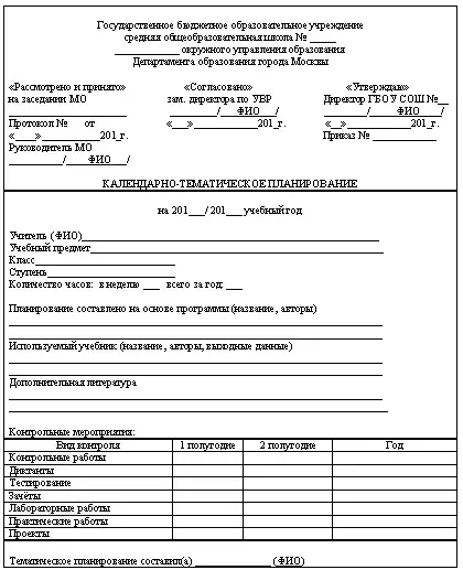 Титульный лист календарно-тематического планирования содержит следующую информацию: