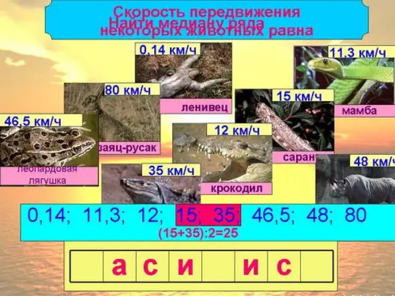 - Ленивец 0,14 км/ч, заяц-русак 80 км/ч, леопардовая лягушка 46,5 км/ч, мамба 11,3 км/ч,