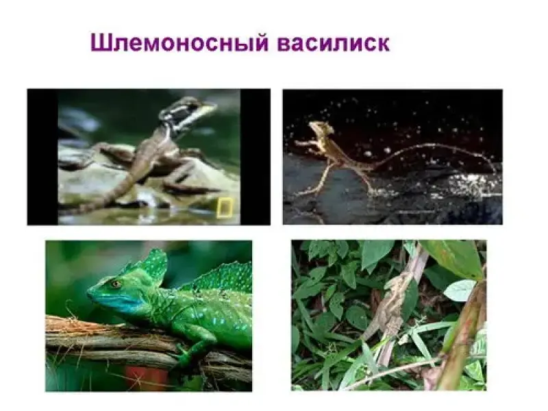 Шлемоносный василиск. Эта довольно крупная рептилия, достигающая 80 см в длину, прекрасно перемещается по ветвям деревьев, отлично плавает, ныряет и даже может затаиваться на дне водоема.