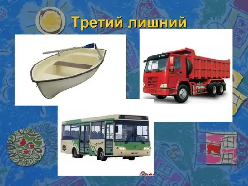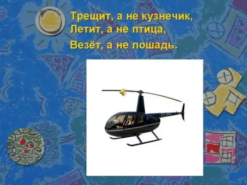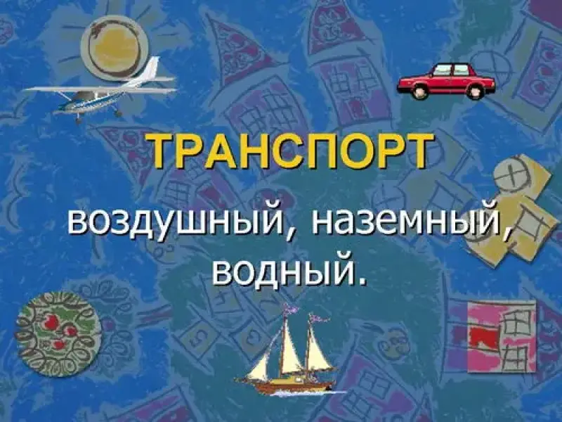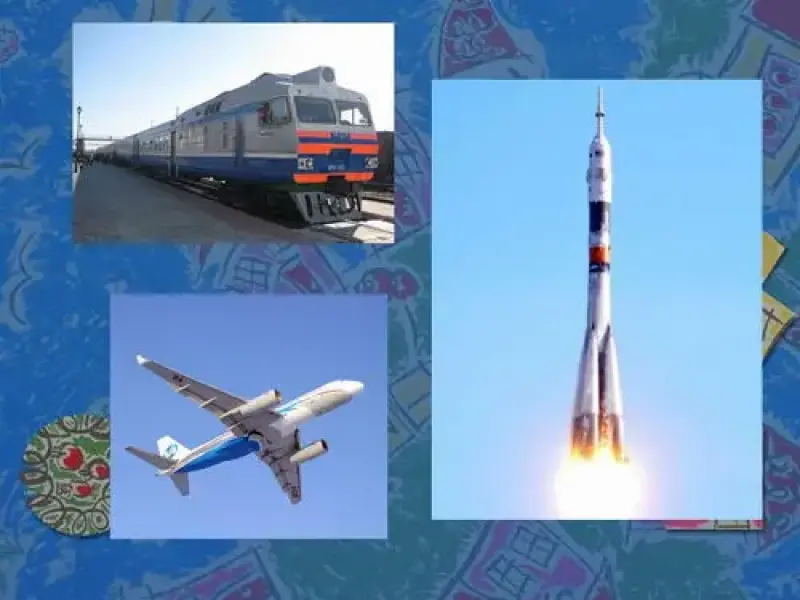 Вертолёт, метро, самолёт, ракета, трамвай, автобус, троллейбус, спутник, парашют, лодка.