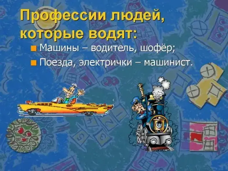 Люди каких профессий водят машины? (водитель, шофер). Поезда и электрички? (машинист).
