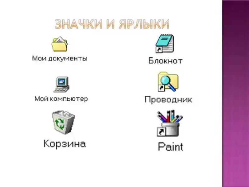 Учитель: На рабочем столе размещаются небольшие картинки - значки и ярлыки. Ярлыки - это значки со стрелочкой в нижнем углу. Они обеспечивают быстрый доступ к объектам - различным