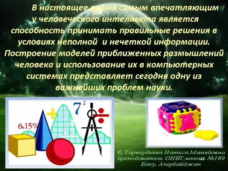 В настоящее время самым впечатляющим у человеческого интеллекта является способность принимать правильные решения в условиях неполной и нечеткой информации. (слайд 7)