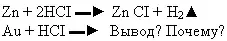1) проанализировать действие соляной кислоты на Zn и Аu.