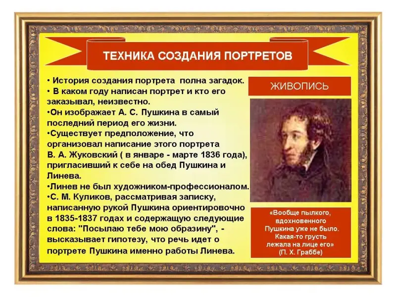 Среди реликвий Музея-квартиры А.С. Пушкина в Санкт-Петербурге есть портрет поэта, написанный художником И.Л. Линевым. Это последнее прижизненное изображение Пушкина. Много пришлось ему перенести незаслуженных обид в эти последние годы. И. С. Тургенев последний раз видел Пушкина незадолго до его гибели в доме В. В. Энгельгардта. «Он стоял у двери, опираясь на косяк, и, скрестив руки на широкой груди, с недовольным видом посматривал кругом. Помню его смуглое, небольшое лицо, его африканские губы, оскал белых, крупных зубов, висячие бакенбарды, темные желчные глаза под высоким лбом почти без бровей и кудрявые волосы…» Именно таким запечатлел поэта художник Линев. То было изображение Пушкина, задыхавшегося в тисках двора, отразившее его тогдашнее душевное состояние.