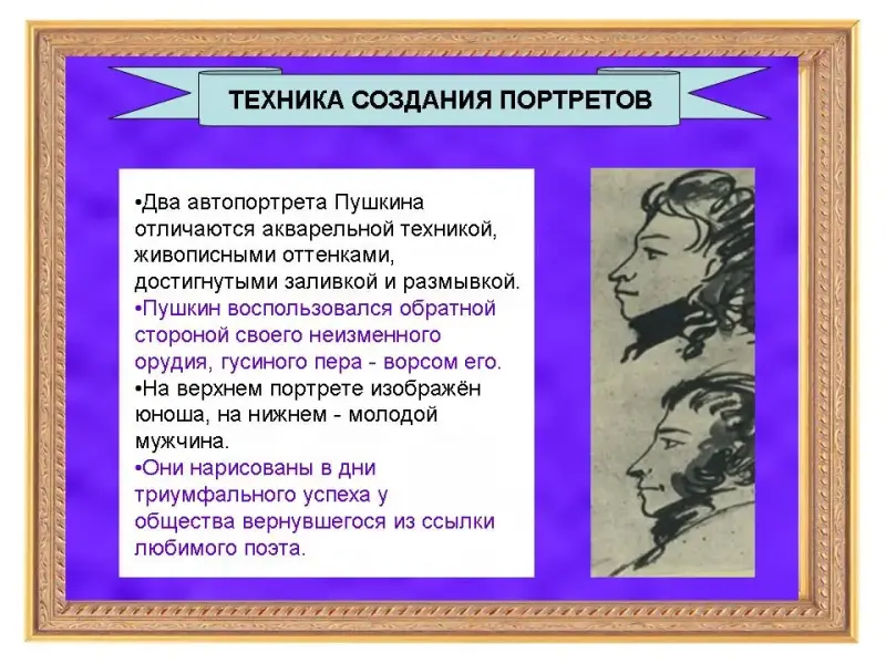 - Автопортеты - надёжные свидетельства особенностей облика Пушкина. Все работы Пушкина точны и содержательны, в то же время трагичны, но совсем не лишены самоиронии.