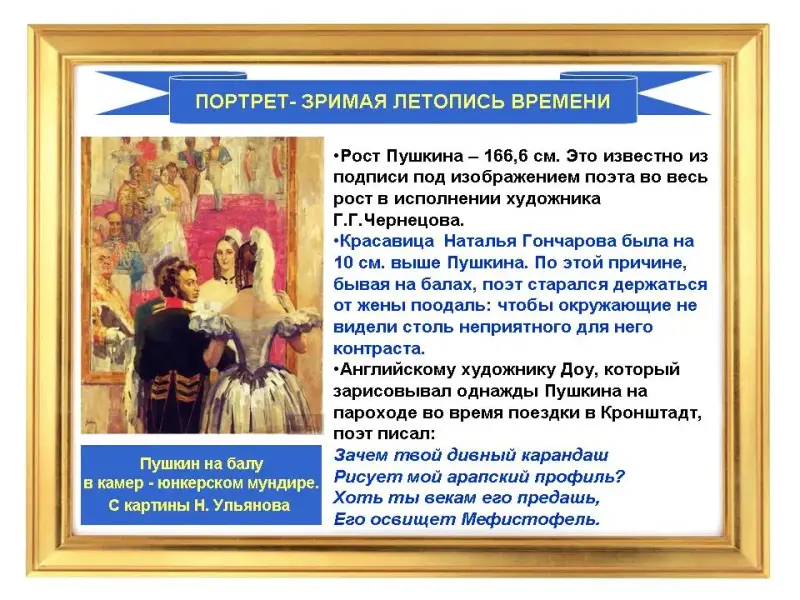 Рост Пушкина - 166,6 см. Это известно из подписи под изображением поэта во весь рост в исполнении художника Г.Г. Чернецова: «Рисовал с натуры, 1832-го года. Апреля 15-го. Ростом 2 арш. 5 вершк. С половиной». Для мужчины это небольшой рост. Красавица Наталья Гончарова была на 10 см. выше Пушкина. По этой причине, бывая на балах, поэт старался держаться от жены поодаль: чтобы окружающие не видели столь неприятного для него контраста.