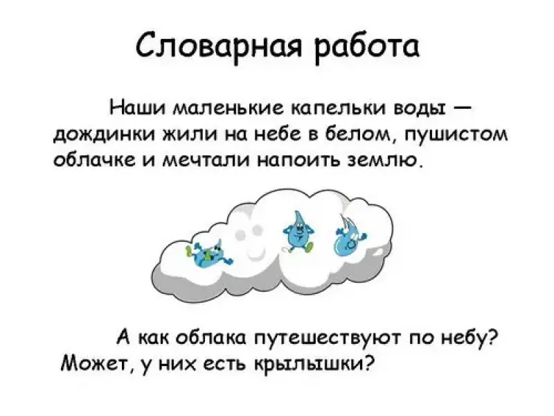 - Наша маленькая капелька воды - дождинка жила на небе в белом, пушистом облачке и мечтала напоить землю. А как облака путешествуют по небу? Может, у них есть крылышки?