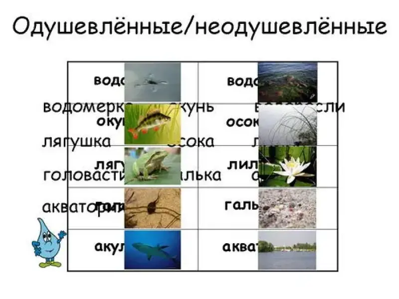 - Распределите существительные в два столбика: в 1-й - одушевленные существительные, во 2-й - неодушевленные: водомерка, окунь, водоросли, лягушка, осока, лилия, головастик, галька, акула, акватория.