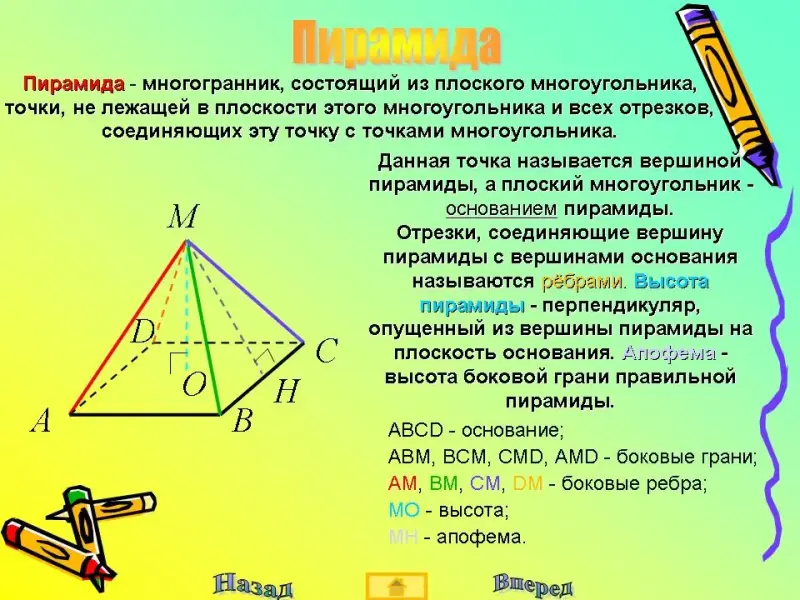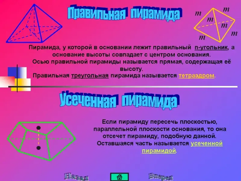 Что называется пирамидой, основанием пирамиды, ребрами, высотой, осью, апофемой. Какая пирамида называется правильной, тетраэдром, усеченной пирамидой?