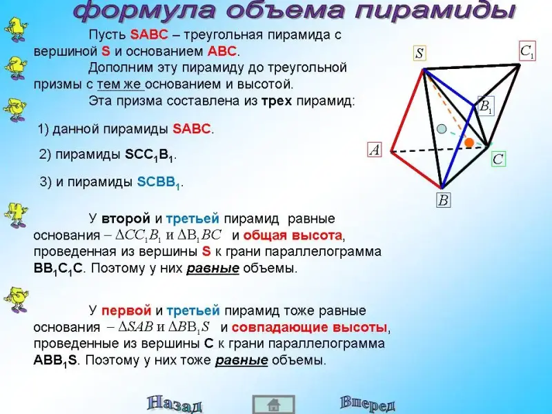 Значит, все три пирамиды имеют один и тот же объем. Так как сумма этих объемов равна объему призмы, то объемы пирамид равны SH/3.