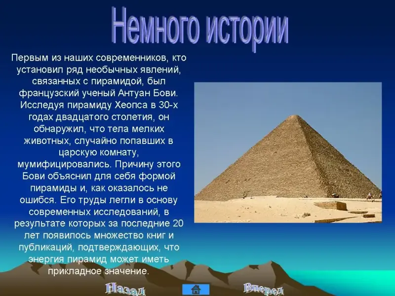 Первым из наших современников, кто установил ряд необычных явлений, связанных с пирамидой, был французский ученый Антуан Бови. Исследуя пирамиду Хеопса в 30-х годах двадцатого столетия, он обнаружил, что тела мелких животных, случайно попавших в царскую комнату, мумифицировались. Причину этого Бови объяснил для себя формой пирамиды и, как оказалось, не ошибся. Его труды легли в основу современных исследований, в результате которых за последние 20 лет появилось множество книг и публикаций, подтверждающих, что энергия пирамид может иметь прикладное значение.