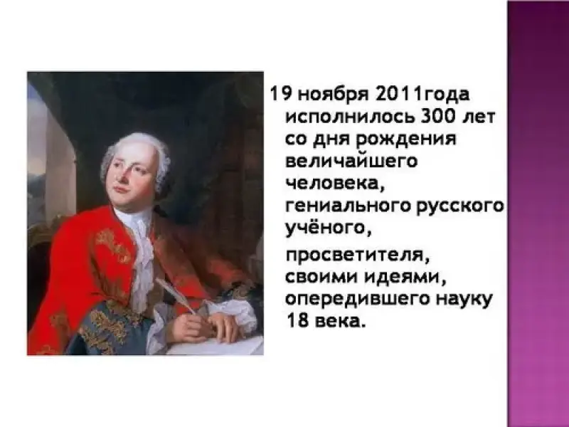 1. Вступительное слово: Сегодня мы с вами продолжаем работать над умножением дробей (слайд № 1). Наше занятие посвящено величайшему человеку, гениальному русскому учёному, просветителю, своими идеями, опередившего науку 18 века. Его вклад в развитие российской науки бесценен. 19 ноября исполнилось 300 лет со дня его рождения (слайд № 2). Кто же это?... А фамилию этого учёного вы узнаете, проверив решение домашней работы.