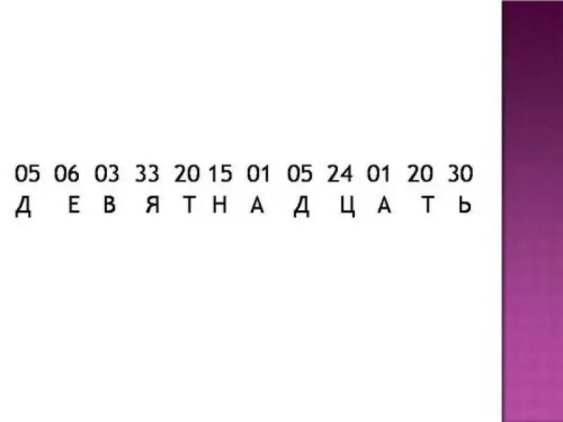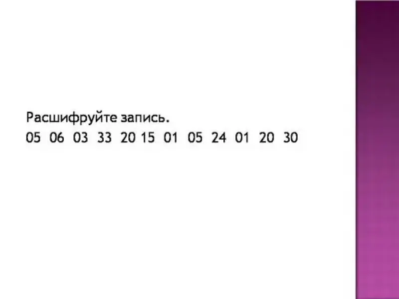 Учитель: Как вы думаете, что вам надо для расшифровки? (Алфавит) А что с ним надо сделать? (Надо пронумеровать буквы) (слайд №8)