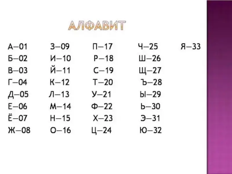 А-01 З-09 П-17 Ч-25 Я-33 Б-02 И-10 Р-18 Ш-26 В-03 Й-11 С-19 Щ-27 Г-04 К-12 Т-20 Ъ-28 Д-05 Л-13 У-21 Ы-29 Е-06 М-14 Ф-22 Ь-30 Ё-07 Н-15 Х-23 Э-31 Ж-08 О-16 Ц-24 Ю-32