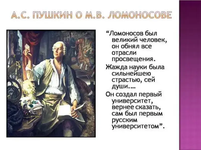 Мы с вами познакомились с малой толикой огромнейшего творчества, изобретений М.В. Ломоносова (слайд №23). Вот как его характеризует А.С. Пушкин: "Ломоносов был великий человек, он обнял все отрасли просвещения. Жажда науки была сильнейшею страстью, сей души.: Он создал первый университет, вернее сказать, сам был первым русским университетом".