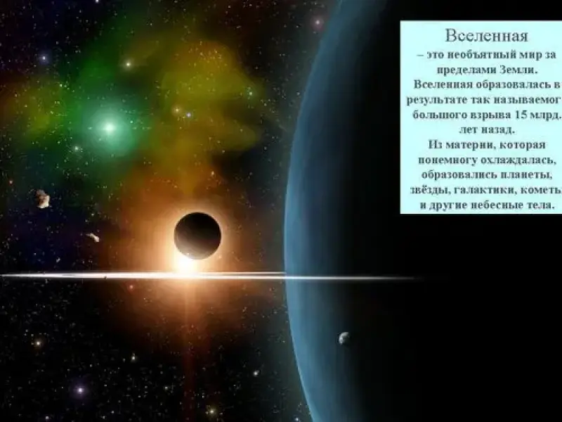 Вселенная образовалась в результате, так называемого, Большого взрыва 15 млрд. лет назад. Из материи, которая понемногу охлаждалась, образовались планеты, звёзды, галактики, кометы и другие небесные тела.