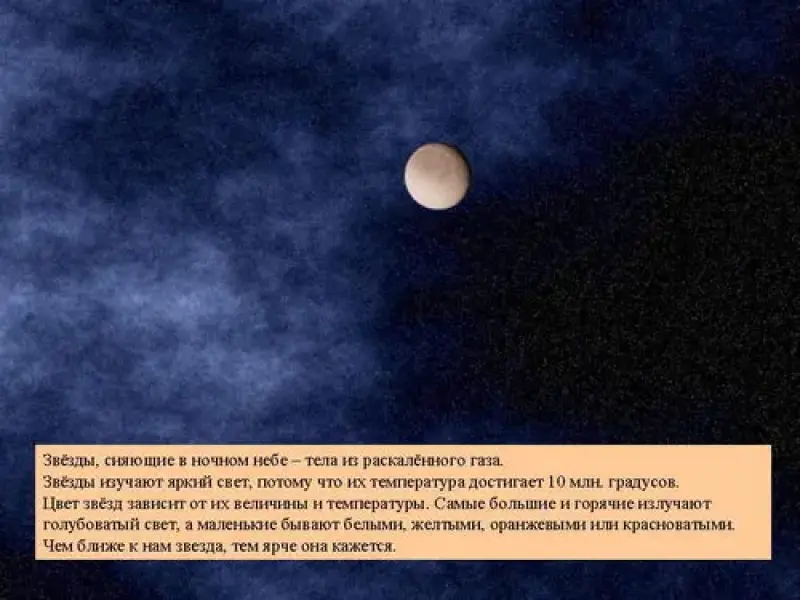 Звёзды, сияющие в ночном небе, - тела из раскалённого газа. Звёзды излучают яркий свет, потому что их температура достигает 10 млн. градусов. Цвет звёзд зависит от их величины и температуры. Самые большие и горячие излучают голубоватый свет, а маленькие бывают белыми, желтыми, оранжевыми или красноватыми. Яркость звёзд зависит от удаленности её от Земли, чем ближе к нам звезда, тем ярче она кажется.