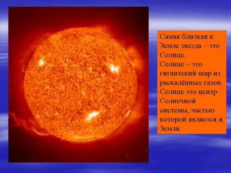 Самая близкая к Земле звезда - Солнце. Солнце - это гигантский шар из раскалённых газов. Солнце считают центром Солнечной системы, частью которой является и Земля.