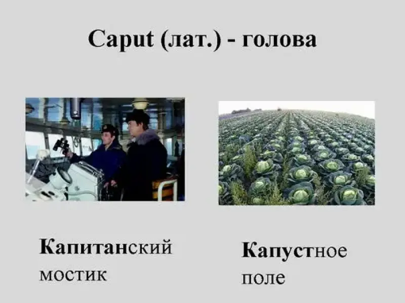 3. Надо помнить, что слова, имеющие общего предка, в современном языке живут своей жизнью и имеют разный морфемный состав. Это можно увидеть на примере слов "капитан" и "капуста" (слайды 15 - 16). Оба они восходят к латинскому "caput" (голова), но сейчас корни у них разные: капитанский мостик - капустное поле
