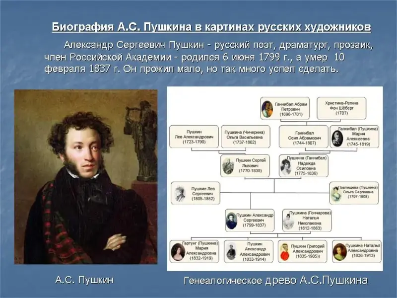 Слайд 2. Учитель: Александр Сергеевич Пушкин - русский поэт, драматург, прозаик, член Российской Академии - родился 6 июня 1799 г., а умер 10 февраля 1837 г. Он прожил мало, но так много успел сделать.