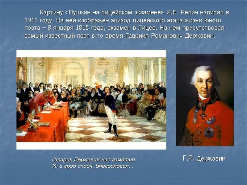 Слайд 4. Ученик 1: Картину "Пушкин на лицейском экзамене" И.Е. Репин написал в 1911 году. На ней изображен эпизод лицейского этапа жизни юного поэта - 8 января 1815 года, экзамен в Лицее. На нем присутствовал самый известный в то время поэт Гавриил Романович Державин.