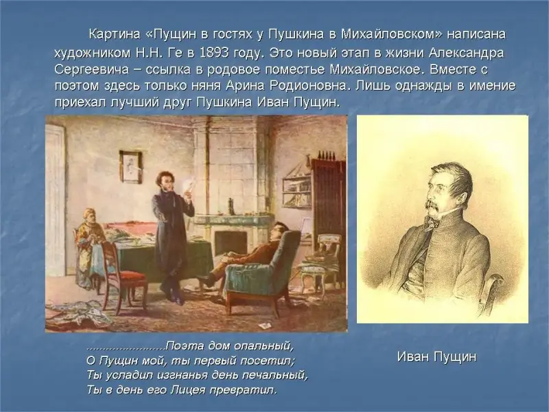 Слайд 5. Ученик 2: Картина "Пущин в гостях у Пушкина в Михайловском" написана художником Н.Н. Ге в 1893 году. Это новый этап в жизни Александра Сергеевича - ссылка в родовое поместье Михайловское. Вместе с ним здесь няня Арина Родионовна. Лишь однажды в имение приехал лучший друг Пушкина Иван Пущин.
