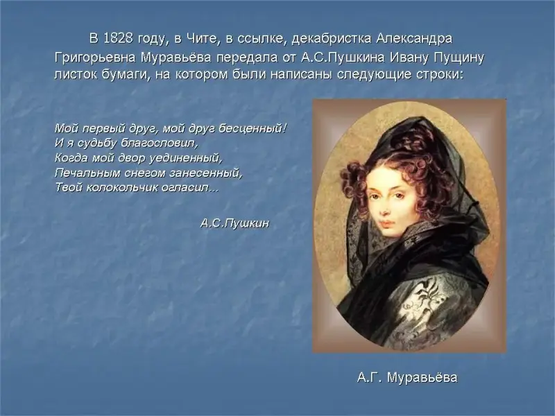 Слайд 7. Ученик 3: В 1828 году, в Чите, в ссылке, декабристка Александра Григорьевна Муравьева передала от А.С.Пушкина Ивану Пущину листок бумаги, на котором были написаны следующие строки: